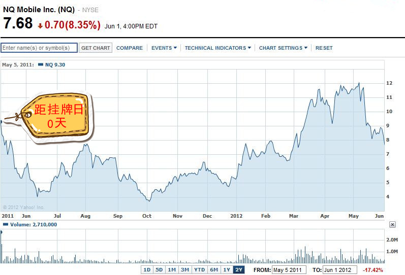 ![]() 2、网秦-网络安全(NYSE:NQ),首次破发距挂牌日:0天 2011年5月6号,手机杀毒厂商网秦登录纳斯达克,发行价为11.5美元,不过当天收盘网秦就跌破了发行价,收于9.30美元。今年年初,网秦股价回温,一度攀高至12美元,但如今已经跌至不到8美元,2012年6月1日收盘价为7.68美元,是发行价的66.8%。 上市当天就破发,与网秦上市前经历的一些突发状况有关,投行退出,赴美融资额减少,用户口碑下降等原因直接导致了投资者信心下降。 ![]() 3、世纪佳缘-社交网站(NASDAQ:DATE),首次破发距挂牌日:0天 2011年5月11日,世纪佳缘登陆纳斯达克IPO,发行价为11美元,首日便跌破发行价,以10.52美元收盘。随后其短暂突破发行价接近14美元,但时至今日,世纪佳缘已经跌至4.39美元,是发行价的39.9%。 世纪佳缘上市时,中概股不再受到热捧,且商业模式存在较大不确定性。