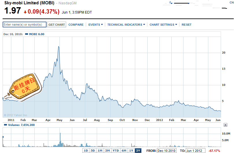这不单单是中概股的问题,也是互联网产业发展到现在,商业模式、盈利前景与前段时间私募市场高企市盈率难以匹配的写照。 看看这两年来上市的中概互联网股,就能明白这个道理。这些公司里,除了奇虎拥有相对巨大的、可期的发展空间,其他大多数公司,其商业模式与盈利能力表现得较为单薄、虚弱。甚至,一些公司的财务报表存在浮夸、疑似造假的状况。基本上,这些公司破发归根于三点:1、资本市场整体趋冷。2、中概股打折受损。3、公司质地本来就不咋地。 你有没有想起上周五李彦宏的那个演讲?他说, 今天,全球的互联网广告,大概就是700多亿美金,这里面至少有450亿美金是搜索模式,也就是说除去单一的搜索商业模式之外,其他的模式并没有赚到太多钱。 在Facebook上市后三日,华兴资本CEO包凡在他微博上如是说: FB的上市也许代表这一波互联网泡沫的终结,毕竟这场盛宴已经挺久了。未来整个行业的价值体系都需要重新评估,许多神话不再。在这个市场里,越早意识到这一点的创业者越有可能成为明天的赢家。如果还有人愿意给你们钱,不要再犹豫了。在一个下行的市场里,最后个出货的往往是最惨的 然。 泡沫正在破灭。既然Facebook上市后第二日亦遭遇破发,72天,对中国互联网公司来说,似乎也变得完全可以接受了。 问题在于,资本市场的冷淡期会持续多久?在这段时期,本来预期要上市拿钱的互联网公司们,又该做何盘算呢? 接下来,让我们看看最近两年上市的、13家破发过、甚至正在破发中的中概互联网公司。 1、斯凯网络-移动互联网(NASDAQ:MOBI),首次破发距挂牌日:0天 2010年12月10日,斯凯在纳斯达克挂牌,发行价为8美元,开盘6.02美元即跌破发行价。2011年中曾短暂突破20美元,不过如今已近跌到不足2美元,2012年6月1日收盘价为1.97美元,是发行价的24.6%。 斯凯网络首日破发,主要是因为斯凯主要打造了一个服务于山寨机等低端手机的平台,但随着智能机崛起,投资者对这一平台模式表示担忧。斯凯上市,即是其巅峰期。