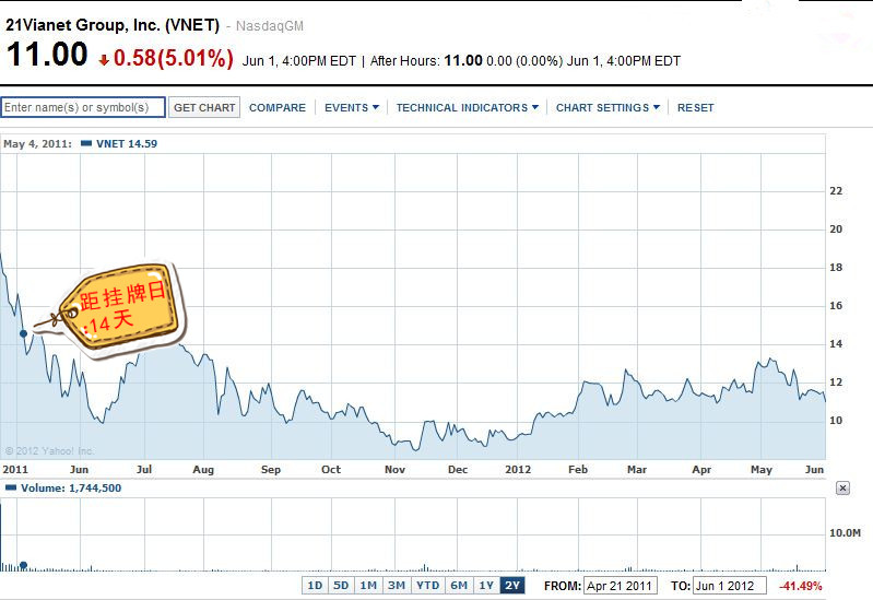8、世纪互联-网络数据服务(NASDAQ:VNET),首次破发距挂牌日:14天 2011年4月21日,世纪互联以15美元发行价在纳斯达克上市,但5月4日,世纪互联就跌破了发行价。2012年6月1日收盘价为11美元,是发行价的73.3%。 跌破发行价的原因:除了中概股危机,更因世纪互联常年亏损的事实,而所在的IDC行业盈利前景相当稀薄。