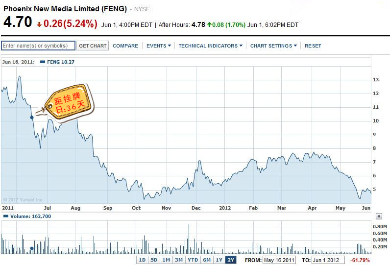 9、凤凰新媒体-门户(NYSE:FENG),首次破发距挂牌日:36天 2011年5月12日,凤凰新媒体登陆纽交所,发行价为11美元,首日大涨34%,报收14.75美元。但坚守了一个月后6月16号,凤凰新媒体破发,至今日股价没有再涨回至发行价,2012年6月1日收盘,凤凰新媒体股价仅为4.7美元,是发行价的42.7%。 凤凰新媒体的破发也是因为中概股丑闻导致的市场大环境不好,其次,凤凰新媒体商业模式是“广告+付费”,其中付费极大依赖于中移动,模式对资本市场形不成刺激。