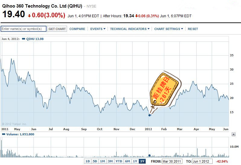 12、奇虎360-网络安全(NYSE:QIHU),首次破发日距挂牌日:281天 2011年3月30日,奇虎360在纽交所上市,发行价为14.5美元。相较于其他中国概念股,奇虎的股价一直表现稳定,并没有随着中概股的丑闻而破发,只是去年年底至今年年初,奇虎360受到美国做空机构质疑后股价短暂下跌。今年1月份,股价短暂触及14.11美元,破发日距离挂牌日281天。随后董事会宣布5000万美元股票回购,遂反弹,时至2012年6月1日,奇虎股价为19.4美元,是发行价的133.8%。
