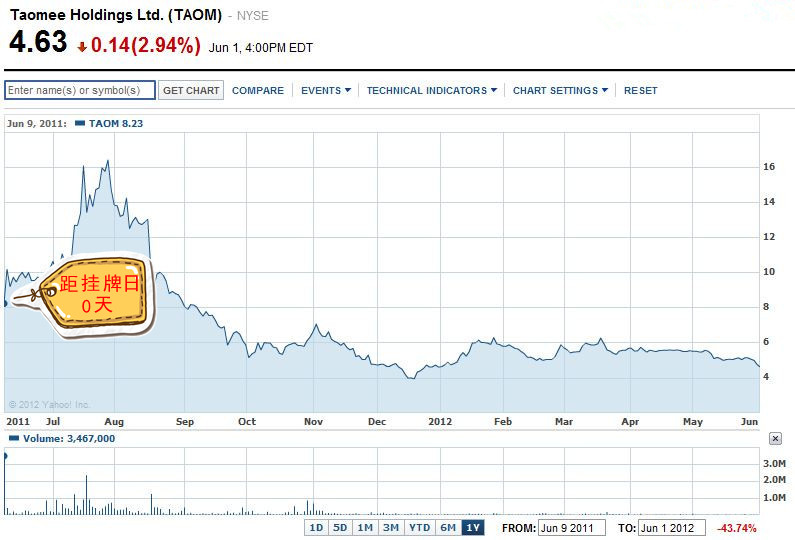 4、淘米网-儿童游戏(NYSE:TAOM),首次破发距挂牌日:0天 2011年6月9日,淘米以9美元发行价登陆纽交所,但其首日就大跌8.6%。虽其后来股价一度回温至14美元,但一年以来仍以下跌为主,2012年6月1日收盘,淘米股价只有4.6美元,是发行价的51.1%。 分析人士认为,淘米破发因与其盈利模式不成熟、财务报表不规范,加之美国投资人对于国内IT企业的信心正不断下降有关。