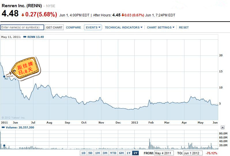 7、人人-社交网站 (NYSE:RENN),首次破发距挂牌日:8天 2011年5月4日,人人网在纽交所上市,发行价为14美元,首日上涨39%至18美元。但5月11日,人人就跌破了发行价。2011年底,股价一度不到4美元。而最近上市的Facebook表现不佳,更是使人人股价继续疲软,昨日股价报收4.48美元,是发行价的32%。 人人网虽是全球第一家上市的社交网站股,但去年中概股丑闻还是殃及了其股价的表现,而时至今日股价仍然偏低主要和其糟糕的营收状况以及Facebook的疲软表现有关。