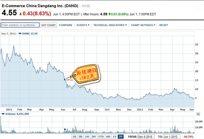 11、当当网-电子商务(NYSE:DANG),首次破发距挂牌日:182天 2010年12月8日,当当网登录纽交所IPO,发行价为16美元,首日报收29.91美元,大涨87%。但自从李国庆大战大摩女后,当当股价经历了半年的下跌,2011年6月7号,当当上市半周年纪念日,当当股价跌破发行价至15美元,破发日距离挂牌日182天。2012年6月1日收盘,其价格仅为4.55美元,是发行价的28.4%。市值仅为3.6亿美元。 上市的时候,当当的财报表现尚可,但受制于高利润率的核心图书业务增速放缓、以及中概股造假和支付宝转移问题,股价迅速下行。